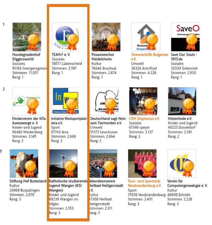 3136 Vereine nahmen an der deutschlandweiten Aktion der ING DiBa in der Kategorie 2 (25 bis 50 Mitglieder) teil. Dabei erreichte unser Verein bei der Abstimmung im Internet mit 2668 Stimmen einen hevorragenden 2. Platz.