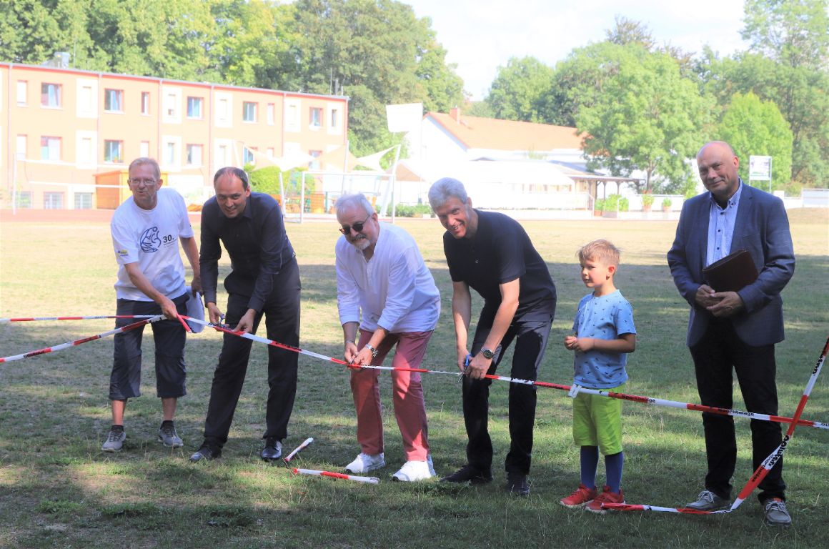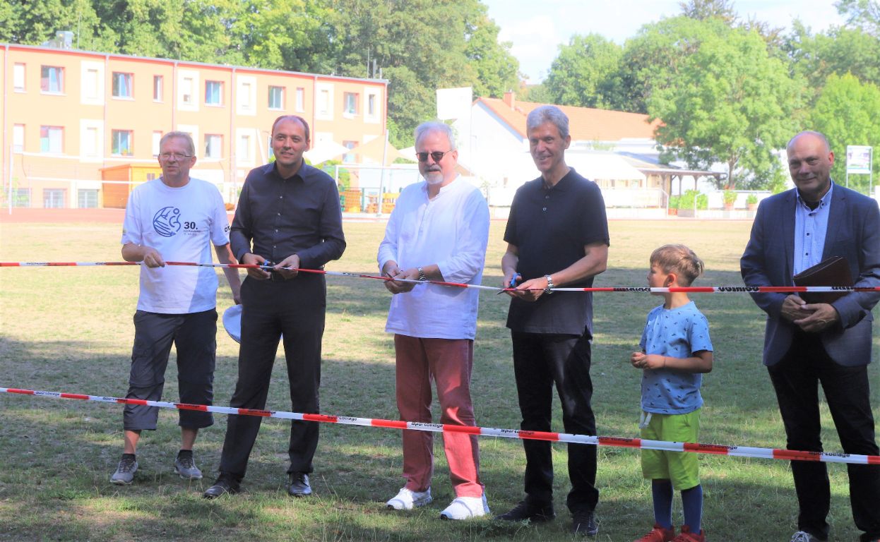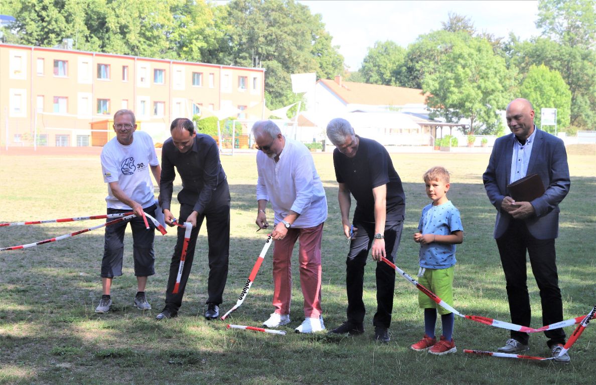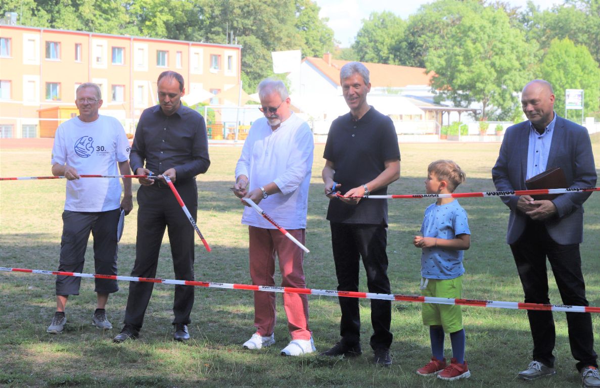Helmut Holter - Thüringens Minister für Bildung, Jugend und Sport , Bürgermeister Christian Gerlitz und Vereinsvorsitzender Rüdiger Schütz durchschnitten das Absperrband und gaben so die Anlage für die Nutzung durch die Bürger der Stadt frei!