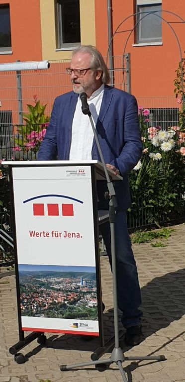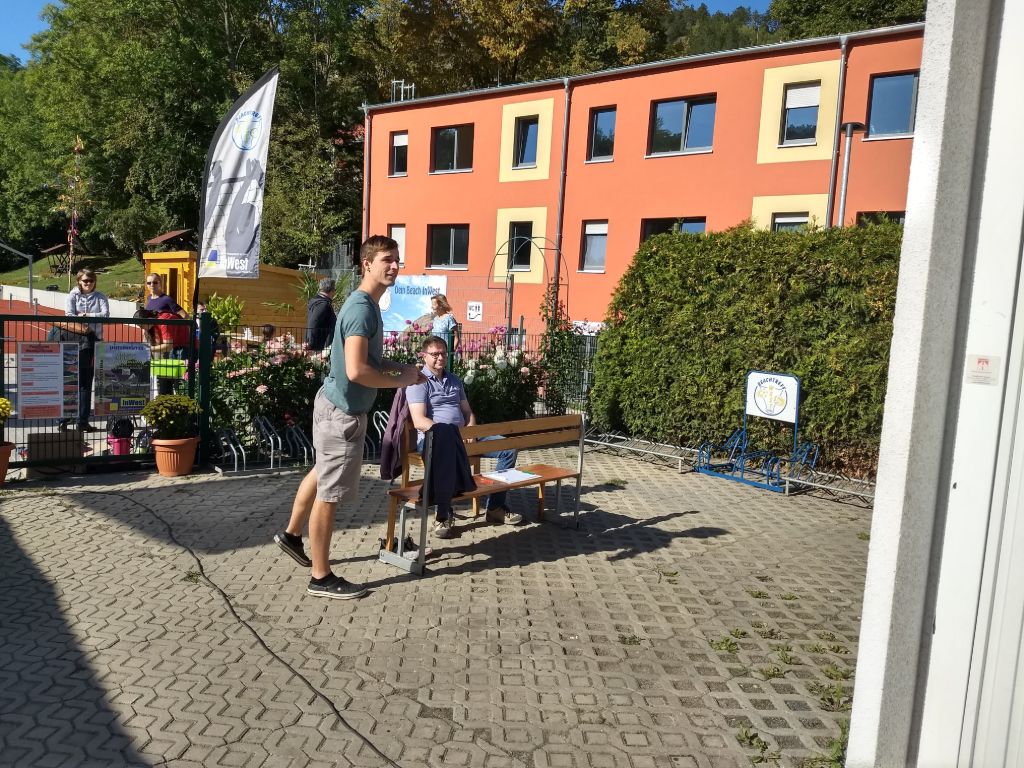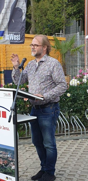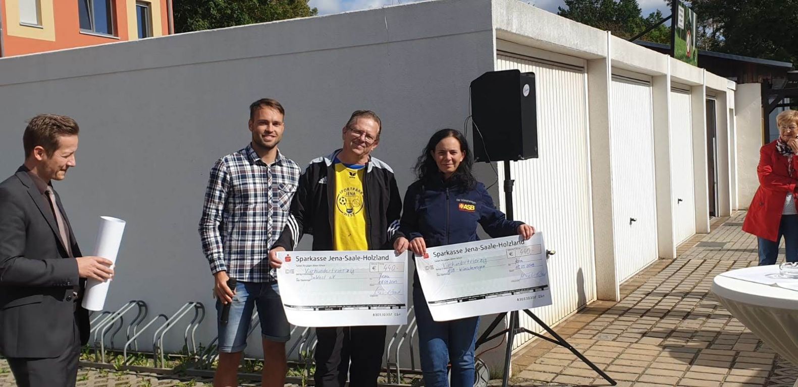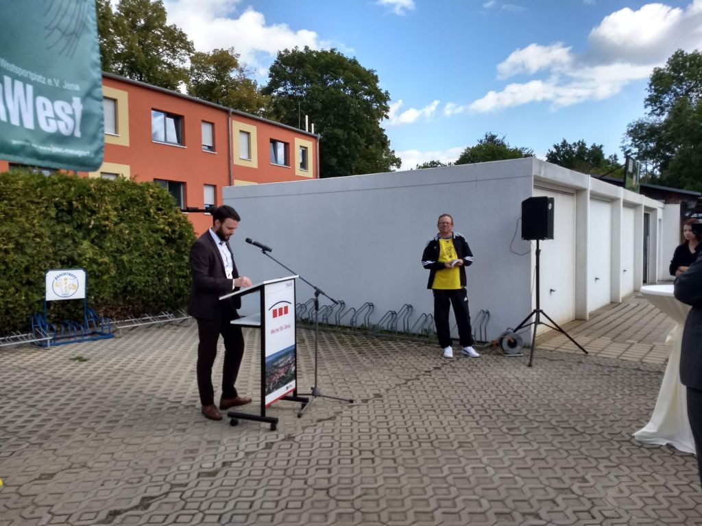 Kurze Statements von Benjamin Koppe (Finanzdezernent Stadt Jena), Karl Hermann Kliewe ( Chef von KIJ), Rüdiger Schütz ( Vorsitzender von Inwest e.V.) und Holger Becker (Ortsteilbürgermeister Jena-West). Zwei Scheckübergaben von 750 € durch Herrn Gottschald (Sparkasse Jena) und Marco Feiler von 440€ (Erlös des 3. Holger Brand Turniers) an den Verein Inwest.